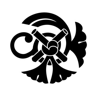 細長い筒をクロスさせた図形を中央におき、そのまわりに銀杏の葉のような飾りがあしらわれた紋。この一風変わった紋は立花家の定紋(公式の家紋)として用いられる祇園守紋です。祇園守紋は京都八坂神社の守り札をあらわしたものとされています。中央の二本の筒が守り札で、銀杏の葉のような飾りは、守り札に結ばれた緒がひらりと広がる様をあらわしているのでしょう。中心に緒の結び目があらわされているのが特徴ですが、この結び目は形式化されて巴文のような形にあらわされることもあります。参照→ 立花家十七代が語る立花宗茂と柳川より引用